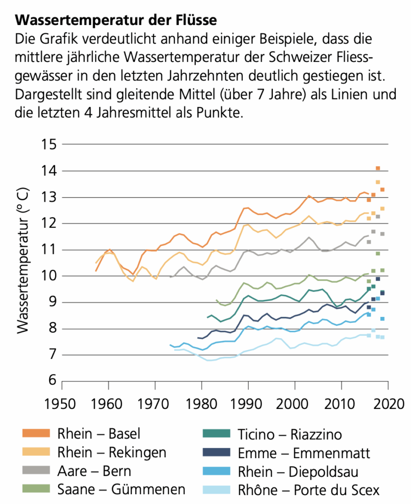 Zunahme der Wassertemperaturen ausgewählter Schweizer Flissegewässer (NCCS, 2021)