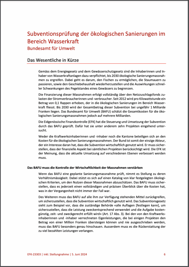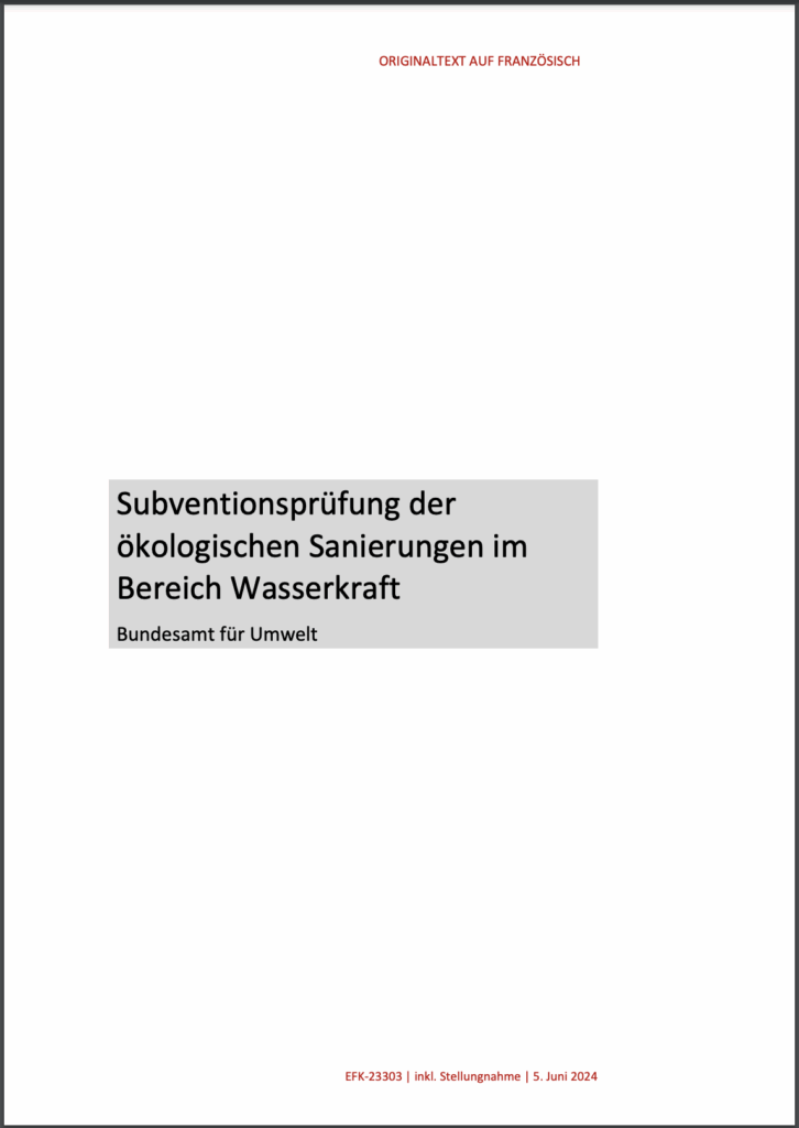 Im Jahr 2023 hat die Eidgenössische Finanzkontrolle (EFK) die ökologische Sanierung der Wasserkraftwerke geprüft. Wie in Fachkreisen schon länger bekannt hält nun auch dieser Bericht fest: Die Frist der Umsetzung bis 2030 wird als unrealistisch eingeschätzt und man müsse mit mehreren Milliarden (!) CHF Kosten rechnen, als mit der bisher erwarten 1 Milliarde.
